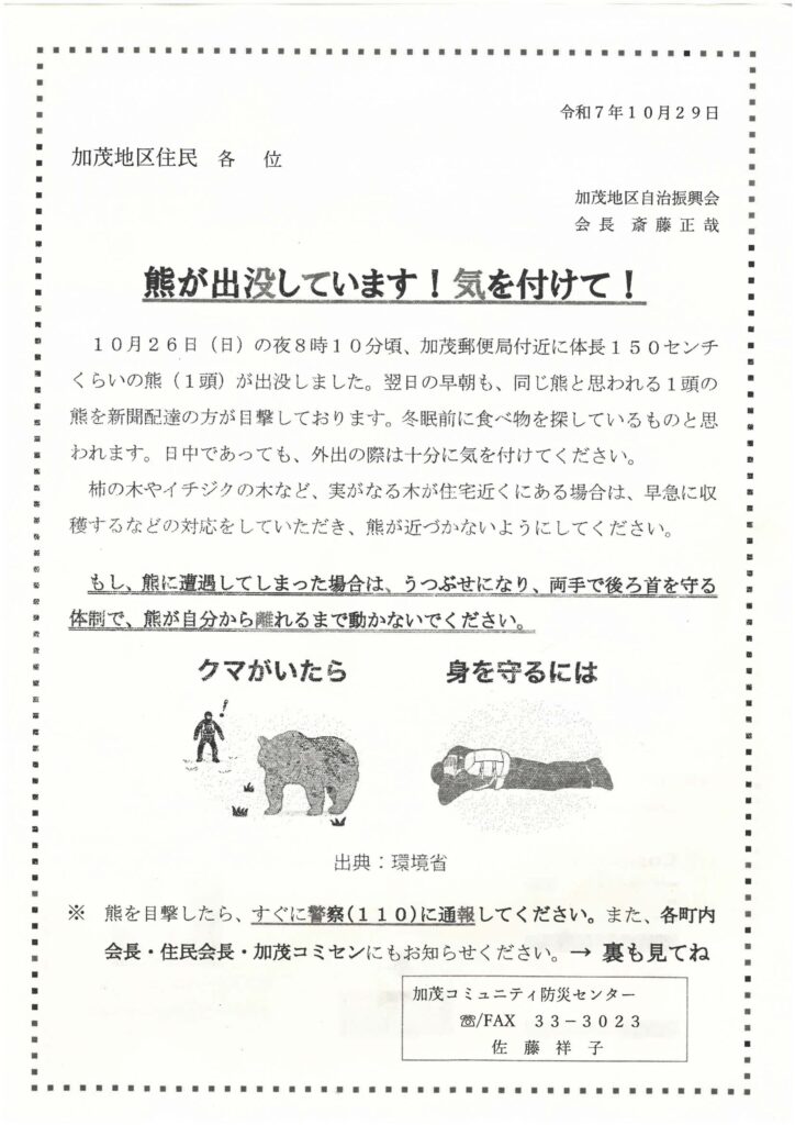令和7年10月26日(日)の夜8時10分頃、加茂郵便局付近に体長150センチくらいの熊(1頭)が出没しました。翌日の早朝も、同じ熊と思われる1 頭の熊を新聞配達の方が日撃しております。冬眠前に食べ物を探しているものと思われます。日中であっても、外出の際は十分に気を付けてください。