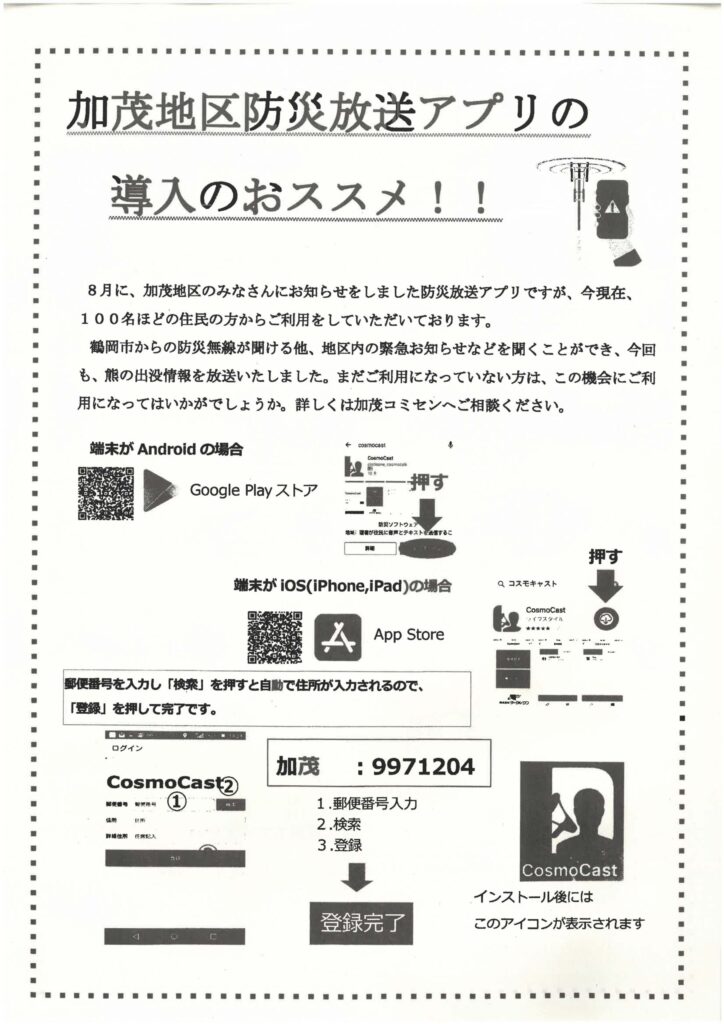 令和7年8月に、加茂地区のみなさんにお知らせをしました防災放送アプリですが、今現在、100名ほどの住民の方からご利用をしていただいております。
