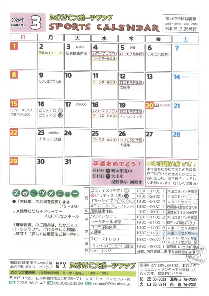 「たかだてスポーツクラブ」さんの令和8年3月のカレンダー・お知らせをアップしました(PDFダウンロードできます)