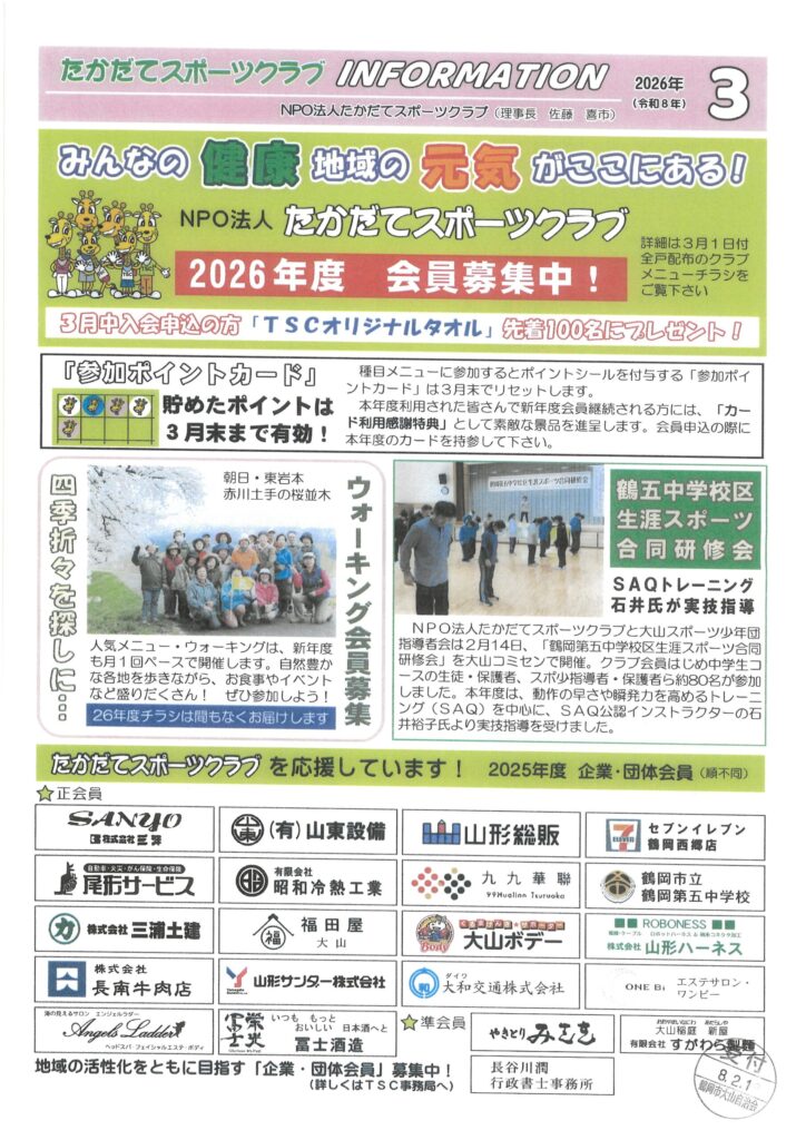 「たかだてスポーツクラブ」さんの令和8年3月のカレンダー・お知らせをアップしました。